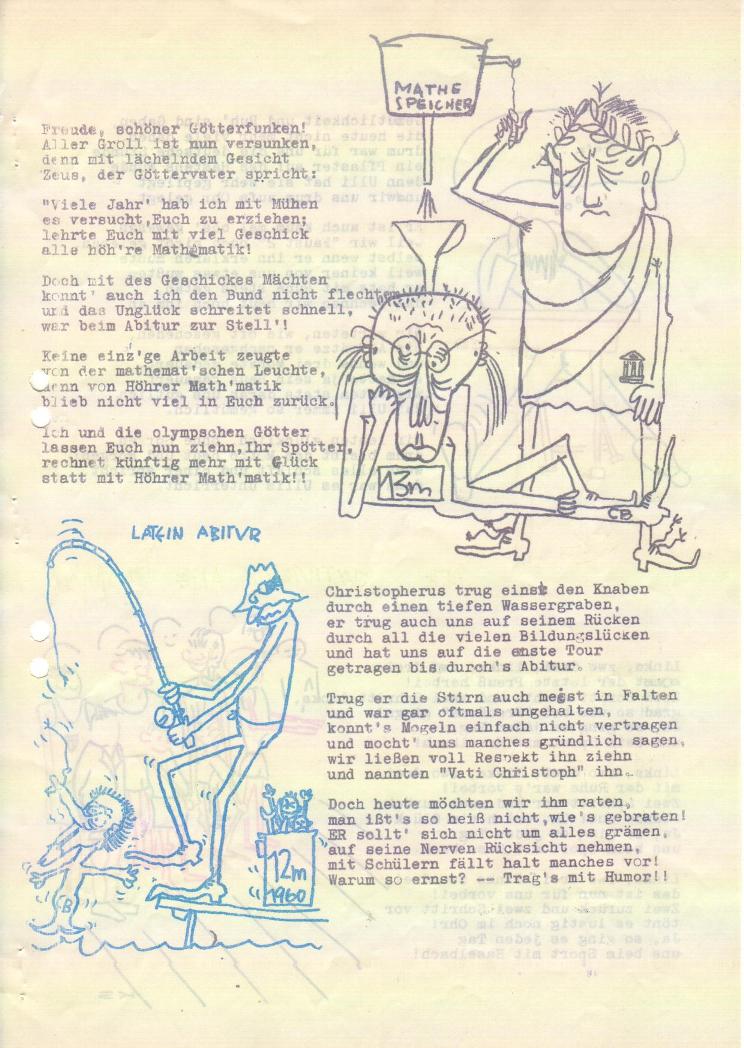 Dies ist unsere Abi-Zeitung. Das Druckverfahren war 1961 schon hitec: Mehrfarbdruck mit Folien. Das Papier war billig, deshalb kann man manchmal die Rückseiten durchschimmern sehen. Aber das macht nichts, so war das eben damals.